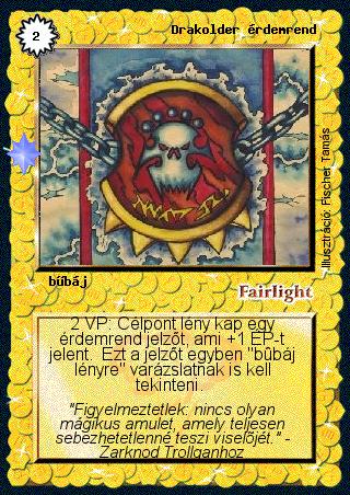 (AK31) A Drakolder érdemrend bűbáj lényre jelzőket ad, amelyek minden szempontból bűbájnak tekinthetők (lehet mágiatörni, fel lehet áldozni a Drakolder mágusnak stb.), de nem számítanak lapnak. | (AK35) A Drakolder érdemrend által adott jelzőket nem lehet negálni, mivel a Negáció csak kártyára működik. | (AK35) A Zan-indukátor a bűbáj jelzők költségét nem csökkenti, mivel az indukátor csak a kijátszási költséget csökkenti, már kijátszott lap aktiválási költségét nem. A két VP pedig a Drakolder érdemrend kártya aktiválási költsége. Másrészt, a jelzők játékba hozatala nem számít kijátszásnak. |