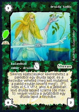 Kiadás: Druida szentély (Zén) Gyakoriság: ritka Lapszín (isten): Sheran Típus: kalandozó Altípus: ember, druida Szöveg: Sikeres kijátszásakor kikereshetsz a paklidból egy druida lapot, és a kezedbe veheted (meg kell mutatnod, a paklid ezután keverd meg!). (P), költs el 5-X VP-t, ahol X a játékban levő druida lapjaid száma (de max. 5): vegyél vissza a gyűjtődből egy druida lapot a kezedbe. Illusztráció: