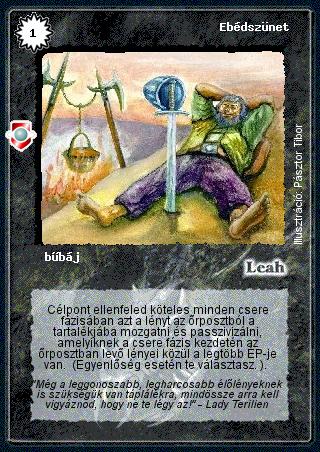 Kiadás: Víziók Gyakoriság: nem gyakori Lapszín (isten): Leah Típus: bűbáj Szöveg: Célpont ellenfeled köteles minden csere fázisában azt a lényt az őrposztból a tartalékjába mozgatni és passzivizálni, amelyiknek a csere fázis kezdetén az őrposztban levő lényei közül a legtöbb ÉP-je van. (Egyenlőség esetén te választasz. ). Szinesítő szöveg: "Még a leggonoszabb, legharcosabb élőlényeknek is szükségük van táplálékra, mindössze arra kell vigyáznod, hogy ne te légy az!" - Lady Terilien Illusztráció: Pásztor Tibor