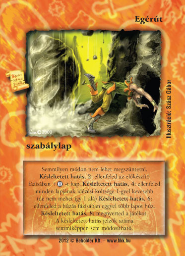 Szöveg: Semmilyen módon nem lehet megszüntetni. Késleltetett hatás, 2: ellenfeled az előkészítő fázisában +1_VP -t kap. Késleltetett hatás, 4: ellenfeled minden lapjának idézési költsége 1-gyel kevesebb (de nem mehet így 1 alá) Késleltetett hatás, 6: ellenfeled a húzás fázisában eggyel több lapot húz. Késleltetett hatás, 8: megnyerted a játékot. A késleltetett hatás jelzők száma semmiképpen sem módosítható.