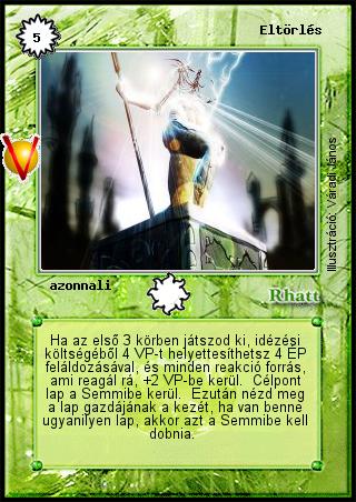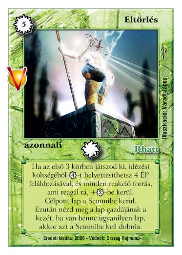 Kiadás: Legendák Völgye, Védnök 2023 Gyakoriság: ritka Lapszín (isten): Rhatt Típus: azonnali Szöveg: Ha az első 3 körben játszod ki, idézési költségéből 4 VP-t helyettesíthetsz 4 ÉP feláldozásával, és minden reakció forrás, ami reagál rá, +2 VP-be kerül. Célpont lap a Semmibe kerül. Ezután nézd meg a lap gazdájának a kezét, ha van benne ugyanilyen lap, akkor azt a Semmibe kell dobnia. Illusztráció: Váradi János