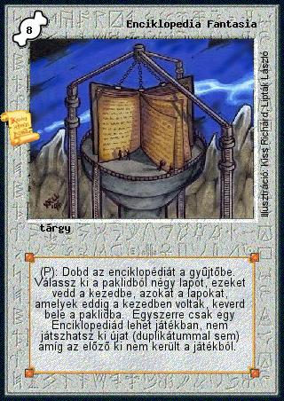 Szöveg: (P): Dobd az enciklopédiát a gyűjtőbe. Válassz ki a paklidból négy lapot, ezeket vedd a kezedbe, azokat a lapokat, amelyek eddig a kezedben voltak, keverd bele a paklidba. Egyszerre csak egy Enciklopediád lehet játékban, nem játszhatsz ki újat (duplikátummal sem) amíg az előző ki nem került a játékból.