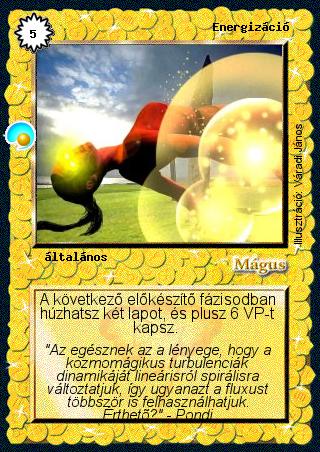 Kiadás: Két világ közt, Alappakli, 6. kiadás (Ősök Városa), Alappakli, 7. kiadás (Ősök Városa) Gyakoriság: ritka Lapszín (isten): Mágus Klán Típus: általános Szöveg: A következő előkészítő fázisodban húzhatsz két lapot, és plusz 6 VP-t kapsz. Szinesítő szöveg: "Az egésznek az a lényege, hogy a kozmomágikus turbulenciák dinamikáját lineárisról spirálisra változtatjuk, így ugyanazt a fluxust többször is felhasználhatjuk. Érthető?" - Pondi Illusztráció: Váradi János