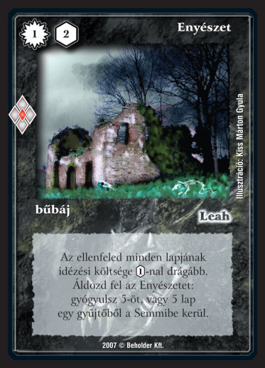 Kiadás: Misztikus Erők Gyakoriság: nem gyakori Lapszín (isten): Leah Típus: bűbáj Altípus: - Szöveg: Az ellenfeled minden lapjának idézési költsége [1]-nal drágább. Áldozd fel az Enyészetet: gyógyulsz 5-öt, vagy 5 célpont lap egy gyűjtőből a Semmibe kerül. Illusztráció: Kiss Márton Gyula