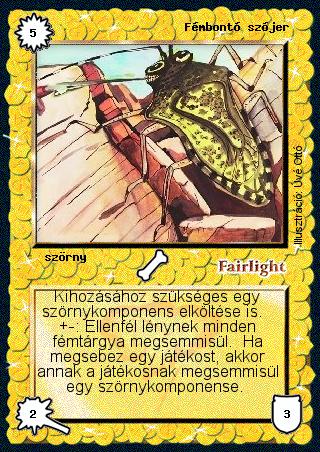 Szöveg: Kihozásához szükséges egy szörnykomponens elköltése is. +-: Ellenfél lénynek minden fémtárgya megsemmisül. Ha megsebez egy játékost, akkor annak a játékosnak megsemmisül egy szörnykomponense.