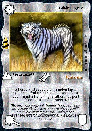 | (AK62) A Fehér Tigris akkor is átkerül az ellenfélhez, ha játékban van egy Hűségem. Igaz, hogy Hűség megvédene attól, hogy a lények gazdát cseréljenek, de a tigris a gazda csere előtt minden lapot a gyűjtőbe küld, így a Hűséget is. Viszont ha a Hűséget játszom ki később, akkor tigris visszakerül hozzám. Más a helyzet az Elmepajzs esetében. Ilyenkor két varázspont elköltésével megakadályozhatom, hogy a tigris átmenjen az ellenfélhez. Persze ez így már kilenc varázspont, egy egyszerű Apokalipszis pedig tízbe kerül. | (AK65) Nem hal meg az ellenfelem Halálmestere, ha nincs más lény játékban és kijátszok egy Fehér Tigrist. A Fehér Tigris úgy működik, hogy először játékba kerül egy 3/3-as lény, majd a tigris kivételével minden lap a gyűjtőbe kerül. Vagyis ekkor már van lény a játékban, amire használni lehet a Halálmester képességét, tehát ha használom, akkor a mester helyett a tigris kerül a gyűjtőbe. | (AK88) Hogyan működik Az utolsó csatával kijátszott Isteni parancs, vagy a Fehér Tigris ? Nos, a HKK általános szabálya, hogy először teljesen létrejön a kijátszott lap hatása, majd utána jönnek létre azok a hatások, amiket más lapok okoznak. Vagyis Az utolsó csatánál először mindannyian kirakjuk az asztalon maradó lapjainkat a lap kijátszója által meghatározott sorrendben. Ezután, ha már minden lap az asztalon van, létrejönnek az egyéb hatások, méghozzá abban a sorrendben, ahogy kiraktuk őket. Ez alapján nem tudom megcsinálni azt pl., hogy lerakom a lapjaimat Az utolsó csatával, a végén az Isteni paranccsal, majd az ellenfél már nem tudja lerakni a lapajait. Ugyanígy az sem megoldható, hogy először az ellenfél pakol le, majd jön a Fehér Tigris, leszedi a lapjait, aztán következnek az én lapjaim. A Fehér Tigris Az utolsó csata mellett az összes asztalra kerülő lapot le fogja szedni. |