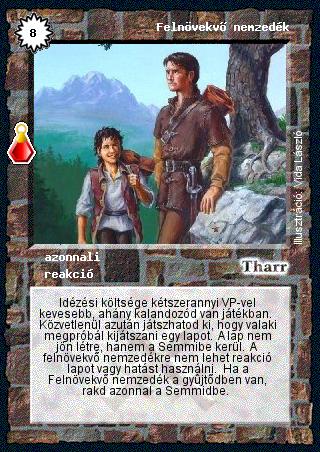 Kiadás: Esthar Császárság Gyakoriság: ritka Lapszín (isten): Tharr Típus: azonnali Altípus: reakció Szöveg: Idézési költsége kétszerannyi VP-vel kevesebb, ahány kalandozód van játékban. Közvetlenül azután játszhatod ki, hogy valaki megpróbál kijátszani egy lapot. A lap nem jön létre, hanem a Semmibe kerül. A felnövekvő nemzedékre nem lehet reakció lapot vagy hatást használni. Ha a Felnövekvő nemzedék a gyűjtődben van, rakd azonnal a Semmidbe. Illusztráció: Vida László
