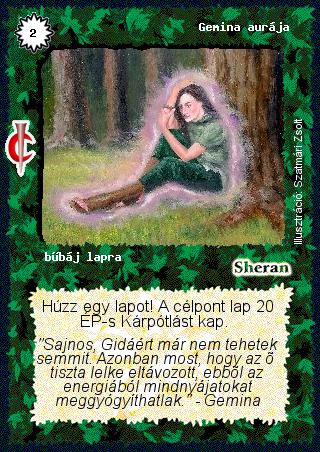 Kiadás: Sötét kor Gyakoriság: gyakori Lapszín (isten): Sheran Típus: bűbáj lapra Szöveg: Húzz egy lapot! A célpont lap 20 ÉP-s Kárpótlást kap. Szinesítő szöveg: "Sajnos, Gidáért már nem tehetek semmit. Azonban most, hogy az ő tiszta lelke eltávozott, ebből az energiából mindnyájatokat meggyógyíthatlak." - Gemina Illusztráció: Szatmári Zsolt