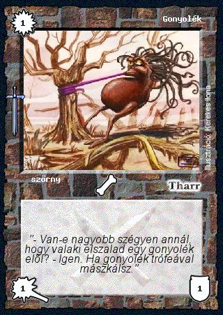 Kiadás: Hőskorszak Gyakoriság: nem gyakori Lapszín (isten): Tharr Típus: szörny Szinesítő szöveg: "- Van-e nagyobb szégyen annál, hogy valaki elszalad egy gonyolék elől? - Igen. Ha gonyolék trófeával mászkálsz." Illusztráció: Kerekes Ilona