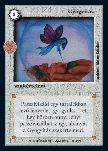 Kiadás: Chara-din visszatér, Túlélők Földje Gyakoriság: gyakori Lapszín (isten): Színtelen Típus: szakértelem Szöveg: Passzivizáld egy tartalékban levő lényedet, ekkor gyógyulsz 1 ÉP-t. Egy körben annyi lényt passzivizálhatsz ezen a módon, ahányas a gyógyítás szakértelmed. Illusztráció: Mojzer Krisztina