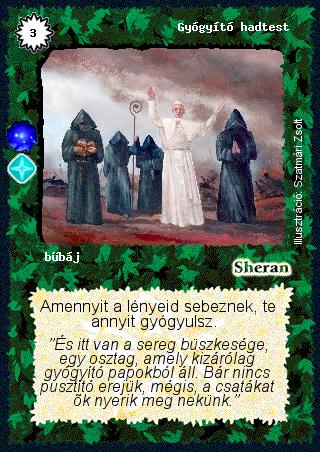 Kiadás: Pozitív létsík (Invázió) Gyakoriság: ritka Lapszín (isten): Sheran Típus: bűbáj Szöveg: Amennyit a lényeid sebeznek, te annyit gyógyulsz. Szinesítő szöveg: "És itt van a sereg büszkesége, egy osztag, amely kizárólag gyógyító papokból áll. Bár nincs pusztító erejük, mégis, a csatákat ők nyerik meg nekünk." Illusztráció: Szatmári Zsolt
