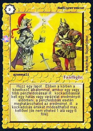 Szöveg: Húzz egy lapot. Ebben a körben a következő alkalommal, amikor egy vagy több pénzfeldobással ill. kockadobással kell egy hatás vagy varázslat eredményét eldönteni, a pénzfeldobás esetén meghatározhatod az eredményt, ill. a kockadobás értékét módosíthatod max. kettővel (de nem viheted 1 alá vagy 6 fölé).