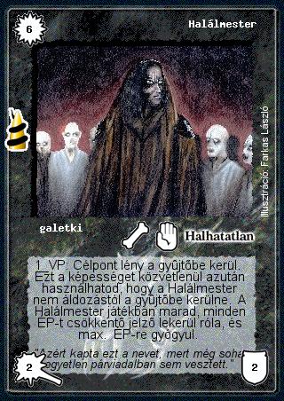 Szöveg: 1 VP: Célpont lény a gyűjtőbe kerül. Ezt a képességet közvetlenül azután használhatod, hogy a Halálmester nem áldozástól a gyűjtőbe kerülne. A Halálmester játékban marad, minden ÉP-t csökkentő jelző lekerül róla, és max. ÉP-re gyógyul.