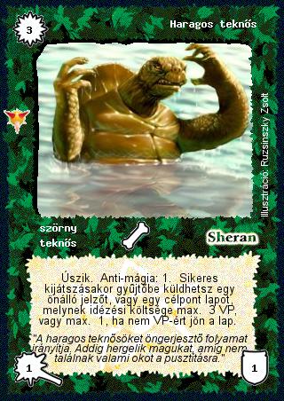 Kiadás: Káoszkatlan, Alappakli, 8. kiadás Gyakoriság: ritka Lapszín (isten): Sheran Típus: szörny Altípus: teknős Szöveg: Úszik. Anti-mágia: 1. Sikeres kijátszásakor gyűjtőbe küldhetsz egy önálló jelzőt, vagy egy célpont lapot, melynek idézési költsége max. 3 VP, vagy max. 1, ha nem VP-ért jön a lap. Szinesítő szöveg: "A haragos teknősöket öngerjesztő folyamat irányítja. Addig hergelik magukat, amíg nem találnak valami okot a pusztításra." Illusztráció: Ruzsinszki Zsolt
