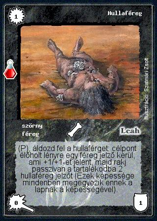 Kiadás: Esthar Császárság Gyakoriság: nem gyakori Lapszín (isten): Leah Típus: szörny Altípus: féreg Szöveg: (P), áldozd fel a hullaférget: célpont élőholt lényre egy féreg jelző kerül, ami +1/+1-et jelent, majd rakj passzívan a tartalékodba 2 hullaféreg jelzőt (Ezek képessége mindenben megegyezik ennek a lapnak a képességével). Illusztráció: Szatmári Zsolt