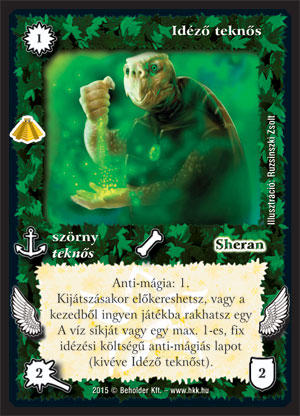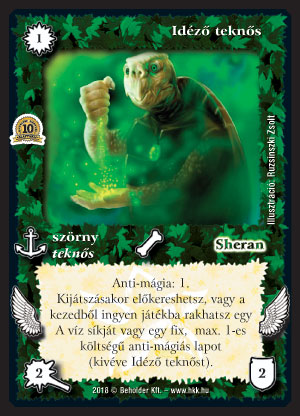 Kiadás: Zarknod visszatér, Alappakli, 10. kiadás Gyakoriság: ritka Lapszín (isten): Sheran Típus: szörny Altípus: teknős Szöveg: Anti-mágia: 1. Kijátszásakor előkereshetsz, vagy a kezedből ingyen játékba rakhatsz egy A víz síkját vagy egy max. 1-es, fix idézési költségű anti-mágiás lapot (kivéve Idéző teknőst). Illusztráció: Ruzsinszki Zsolt