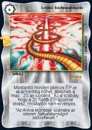 | (AK15) A HKK-ban kétféle ÉP-vesztést különböztetünk meg, a feláldozást és a sebződést. Ha mágiatörik az Isteni közbeavatkozást, és így vesztesz 10 ÉP-t, az semmiképpen nem minősíthető feláldozásnak, új fogalmat nem akarunk bevezetni, így erre az esetre marad a sebződés. | (AK69) Végtelen lesz az életpontom, ha egy Isteni közbeavatkozás van játékban, és létrejön A jövő alakítása, vagyis amíg nem szedik le az Isteni közbeavatkozást, sebzéssel nem csökkenhet az életpontom nullára. | (AK92) Mi történik akkor, ha Rubintos aurát rakok egy Trogloditára, vagy egy Troglodita hercegre, és használni is akarom? Az aura gyengülés jelzőt rak a lényre és te gyógyulsz tőle. Itt a jelző rárakása a hatás költsége, vagyis a hercegen nem lehet használni, mivel arra nem kerülhet gyengülés jelző. A Torgloditára használható, és mivel neki a gyengülés jelző +1 ÉP-t ad, ezért a végtelen életpontja lesz, te pedig maxba gyógyulhatsz vele mindig, illetve végtelenbe, ha van a játékban pl. Isteni közbeavatkozásod. Elég jó kis kombó, de lapleszedéssel továbbra is elpusztítható a Troglodita. |