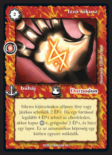 Szöveg: Sikeres kijátszásakor célpont lény vagy játékos sebződik 2 ÉP-t. Ha egy forrással legalább 4 ÉP-t sebzel az ellenfeleden, akkor kapsz 1_VP-t, gyógyulsz 2 ÉP-t, és húzz egy lapot. Ez az automatikus képesség egy körben egyszer működik.