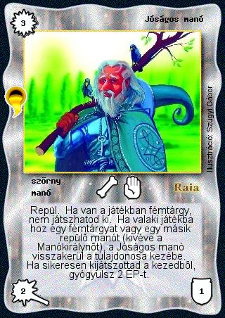 Szöveg: Repül. Ha van a játékban fémtárgy, nem játszhatod ki. Ha valaki játékba hoz egy fémtárgyat vagy egy másik repülő manót (kivéve a Manókirálynőt), a Jóságos manó visszakerül a tulajdonosa kezébe. Ha sikeresen kijátszottad a kezedből, gyógyulsz 2 ÉP-t.