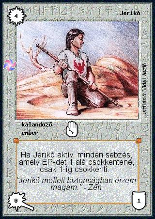 Kiadás: Létsíkok, Túlélők Földje Gyakoriság: ritka Lapszín (isten): Színtelen Típus: kalandozó Altípus: ember Szöveg: Ha Jerikó aktív, minden sebzés, amely ÉP-det 1 alá csökkentené, csak 1-ig csökkenti. Szinesítő szöveg: "Jerikó mellett biztonságban érzem magam." - Zén Illusztráció: Vida László