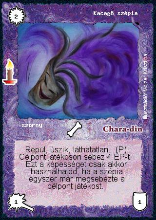 Szöveg: Repül, úszik, láthatatlan. (P): Célpont játékoson sebez 4 ÉP-t. Ezt a képességet csak akkor használhatod, ha a szépia egyszer már megsebezte a célpont játékost.