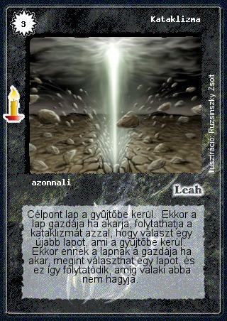 Kiadás: Múltidéző Gyakoriság: ritka Lapszín (isten): Leah Típus: azonnali Szöveg: Célpont lap a gyűjtőbe kerül. Ekkor a lap gazdája ha akarja, folytathatja a kataklizmát azzal, hogy választ egy újabb lapot, ami a gyűjtőbe kerül. Ekkor ennek a lapnak a gazdája ha akar, megint választhat egy lapot, és ez így folytatódik, amíg valaki abba nem hagyja. Illusztráció: Ruzsinszki Zsolt