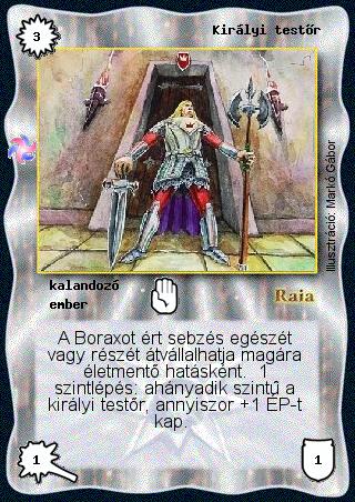 Kiadás: Létsíkok Gyakoriság: gyakori Lapszín (isten): Raia Típus: kalandozó Altípus: ember Szöveg: A Boraxot ért sebzés egészét vagy részét átvállalhatja magára életmentő hatásként. 1 szintlépés: ahányadik szintű a királyi testőr, annyiszor +1 ÉP-t kap. Illusztráció: Markó Gábor