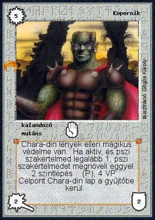 Kiadás: Chara-din visszatér Gyakoriság: nem gyakori Lapszín (isten): Színtelen Típus: kalandozó Altípus: mutáns Szöveg: Chara-din lények ellen mágikus védelme van. Ha aktív, és pszi szakértelmed legalább 1, pszi szakértelmedet megnöveli eggyel. 2 szintlépés: (P), 4 VP: Célpont Chara-din lap a gyűjtőbe kerül. Illusztráció: Gőgös Károly