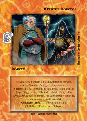 Szöveg: Használhatsz mellette 2 másik különböző követőt, de A legfőbb követőt vagy szabálylapot nem. A játékot 2 lappal kezded, de ha a játék elején letiltják 4-gyel (függetlenül a többi követődtől), és ilyenkor egyik követőd sem működik. Ha játék közben tiltják le, az nincs hatással a többi követődre. Késleltetett hatás, 3: a késleltetett hatás jelzők lekerülésekor húzz 1 lapot!