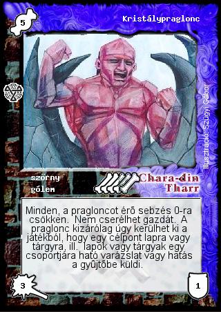 (AK28) A Kristálypraglonc egy lény, annak ellenére, hogy szörnykomponensből kell kijátszani. Azaz minden varázslat és hatás, amely egy adott lényre hat, az a pragloncra is hat, két kivétellel. Az első, hogy a sebző varázslatok és hatások 0-át sebeznek rajta. Vagyis rá lehet lőni a Tisztítótüzet, bele lehet parittyázni, meg lehet ütni lényekkel, de a sebzés minden esetben 0 lesz. A második kivételt pedig az olyan varázslatok és hatások jelentik, amelyek gyűjtőbe küldenek egy-egy lényt (pl. Járvány, Uman szelleme), vagy a játékból kiraknak (pl. Elimináció, Élőholt mágus, Kiűzetés) lényeket. Ezeket is lehet a pragloncra használni, csak semmilyen hatásuk nincs rá. Tehát lehet rá használni a Sötét kastplomot, és a kastplomjelzők erősítik is, meg lehet idézni Nagyobb idézéssel (ez esetben, ha játékban akarom tartani, ki kell fizetni mind az öt komponenst, a -2 VP itt értelmezhetetlen). A tárgyakra vonatkozó hatások és varázslatok viszont csak akkor hatnak rá, ha az a varázslat vagy hatás a gyűjtőbe küldi a tárgyat, azaz jelen esetben a pragloncot (pl. Gigaököl, Unkreáció). A többi tárgyra ható varázslatnak és hatásnak (pl. Ferratáció, Lopás szakértelem, Gnóm mágus) semmi hatása nincs a pragloncra. A lapokra illetve lapok egy csoportjára ható varázslatok és hatások (pl. A gyenge pusztulása, Déja vu, Apokalipszis, Kisebb kívánság, Teljes fordulat stb.) korlátozás nélkül kifejtik hatásukat a Kristálypragloncra. A Vulkánkitörés, a Savhurrikán és a hasonló varázslatok a lények egy csoportjára hatnak, és mivel a lények is lapok, ezért ezek is beleesnek a "lapok egy csoportjára ható" varázslatok kategóriájába, azaz ezek is leszedik a pragloncot.