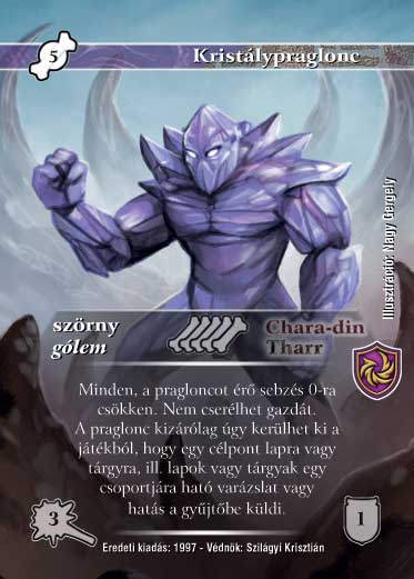 Kiadás: Isteni szövetség, Védnök 2023, Túlélők Földje Gyakoriság: ritka Lapszín (isten): Chara-din-Tharr Típus: szörny Altípus: gólem Szöveg: Minden, a pragloncot érő sebzés 0-ra csökken. Nem cserélhet gazdát. A praglonc kizárólag úgy kerülhet ki a játékból, hogy egy célpont lapra vagy tárgyra, ill. lapok vagy tárgyak egy csoportjára ható varázslat vagy hatás a gyűjtőbe küldi. Illusztráció: