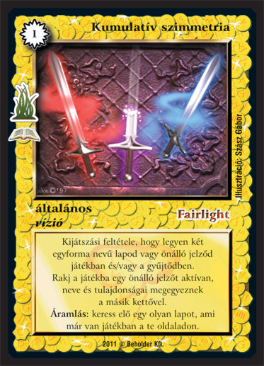 Szöveg: Kijátszási feltétele, hogy legyen két egyforma nev? lapod vagy önálló jelz?d játékban és/vagy a gy?jt?dben. Rakj a játékba egy önálló jelz?t aktívan, neve és tulajdonságai megegyeznek a másik kett?vel. Áramlás: keress el? egy olyan lapot, ami már van játékban a te oldaladon.