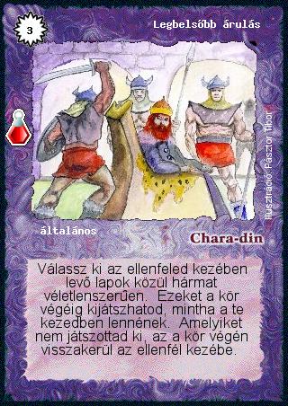 Szöveg: Válassz ki az ellenfeled kezében levő lapok közül hármat véletlenszerűen. Ezeket a kör végéig kijátszhatod, mintha a te kezedben lennének. Amelyiket nem játszottad ki, az a kör végén visszakerül az ellenfél kezébe.