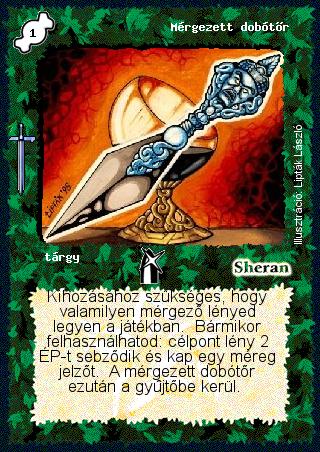 Szöveg: Kihozásához szükséges, hogy valamilyen mérgező lényed legyen a játékban. Bármikor felhasználhatod: célpont lény 2 ÉP-t sebződik és kap egy méreg jelzőt. A mérgezett dobótőr ezután a gyűjtőbe kerül.