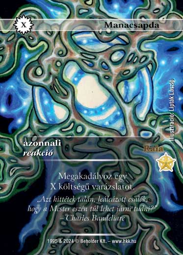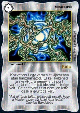 (AK18) Az azonnali reakció varázslatok előbb létrejönnek mint az a varázslat amire reagálnak (ld. Ellenvarázslat, Manacsapda). Tehát ha a Déja vumet, vagy a Tudati vitalizációmat manaégetik, akkor először végrehajtódik a Manaégés, azután gyógyulsz a vitalizációtól vagy jön a Déja vu. | (AK19) A Destabilizátor azokra az azonnali varázslatokra hat, melyek szövegében szerepel a "közvetlenül azután játszhatod ki" szöveg (Az elme fölénye, Ellenvarázslat, Manacsapda, Agybénítás, Manaégés, Dornodon visszavág, Rughar dilemmája, Ő a kegyencem, Azt mondtam, nem (ultraritka)), melyeket közvetlenül az ellenfél húzási fázisa után is ki lehet játszani (Passzivitás, Tudatrombolás, Elzárás), valamint A gyenge erejére és a Negációra, ha ez utóbbi kettőt reakcióként használják. | (AK2) Egy lap idézési költségének a bal felső sarokba írt számot kell tekinteni, de ha a szöveg alapján - a hatás erősségétől függően - további VP-t kell még költeni, ez szintén beletartozik az idézési költségbe. Pl. az Azonnali gyógyítás és Jégcsóva idézési költsége nem 2, hanem 2 plusz annyi, amennyi VP-t pluszban elköltünk. Ez főként a Manaégésnél és a Manacsapdánál lehet fontos. Ha egy lap csökkenti az idézési költséget (Zan-indukátor) vagy növeli (Agyzavarás) akkor az így módosított idézési költséget kell figyelembe venni. | (AK2) Ha célpont varázslat szörnykomponensből jön ki (pl. Megvesztegetés), akkor is lehet manacsapdázni. Ekkor a Manacsapda költsége annyi VP, ahány szörnykomponens volt az eredeti varázslat költsége. | (AK23) A Földanya amulettjével az azonnali reakció lapokat lehet eldobatni. A harmadik kiadástól kezdve lettek megkülönböztetve az azonnali reakció lapok, így ebben a kiadásban már az Agybénításra, Manacsapdára, Az elme fölényére, a Jellemtükörre és a Manaégésre rákerült az, hogy azonnali reakció. Rajtuk kívül azonnali reakció még a Dornodon visszavág (itt nem szerepel ugyan a lapon, de a Chara-din visszatér megjelenésekor még nem volt ilyen varázslatkategória), az Ő a kegyencem és az Azt mondtam, nem. A gyenge ereje és a Negáció csak akkor változik reakció lappá, amikor kijátszásra kerülnek, ezek nem azonnali reakció lapok, tehát nem lehet őket eldobatni. | (AK37) Reakció lapok: Ha az ellenfelem kijátszik egy Sötét halált, én ellenvarázsolom, ő feláldozza Maigner Lopotomosát és hatástalanítja az én ellenvarázslatomat, akkor én még ellenvarázsolhatom az eredeti Sötét halált. Ilyenkor még bármilyen reakciólapot ki lehet játszani az eredeti varázslatra. Sőt, a következő trükk is működik: Az ellenfél Sötét halálját ellenvarázsolom, ő agybénítja, én ismét ellenvarázsolom, ő is ellenvarázsolja, és nekem már csak 2 VP-m és Manacsapdám van, ezért az agybénítását manacsapdázom. | (AK37) Ha az ellenfelem kijátszik egy Sötét halált, én ellenvarázsolom, ő feláldozza Maigner Lopotomosát és hatástalanítja az én Ellenvarázslatomat, akkor én még ellenvarázsolhatom az eredeti Sötét halált. Ilyenkor még bármilyen reakciólapot ki lehet játszani az eredeti varázslatra. Sőt a következő trükk is működik: Az ellenfél Sötét halálját ellenvarázsolom, ő agybénítja, én ismét ellenvarázsolom, ő is ellenvarázsolja, és nekem már csak 2 VP-m és Manacsapdám van, ezért az Agybénítását manacsapdázom. | (AK4) Megkülönböztetünk alap és módosított idézési költséget. Egy lapnak az alap idézési költsége az a szám, amely a bal felső sarkába van írva. Amennyiben itt ? vagy X szerepel, illetve a kártya szövege szerint a bal felső sarokba írt számon kívül még további VP-t kell elkölteni, akkor az alap idézési költség a megfelelő behelyettesített érték. Ha a lap nincs játékban (a gyűjtőben, a pakliban, vagy a kézben van), akkor az X-et illetve a pluszban költendő VP-t nullának kell számolni. A ?-nél pedig a lehető legkisebb érték (pl. Tolvajszemnél 1). A módosított idézési költség az alap idézési költségnek játékban levő lapokkal módosított értéke. Ilyen lap lehet pl. egy templom, A béke erdeje, Agyzavarás. A legtöbb idézési költséget említő lap az alap idézési költségre vonatkozik. Néhány kivétel van, mint például a Manacsapda: ha mondjuk kint van egy Sheran temploma, és valaki kijátszik egy Tűzesőt 7+1 VP-ért, a Manacsapdára a módosított idézési költséget (8-at) kell elkölteni, és a templom miatt a Manacsapda idézési költsége eggyel nagyobb, tehát összesen 9-be fog kerülni. Példa az alap idézési költségre: kint van egy Zan-indukátor, kezemben van egy Azonnali gyógyítás. Amíg az Azonnali gyógyítás a kezemben van, addig az alap idézési költsége 2. Kijátszom, gyógyítok 3 ÉP-t, tehát 5 VP-t kell költenem: a kijátszás pillanatában tehát az Azonnali gyógyításom alap idézési költsége 5. A Zan-indukátor miatt eggyel kevesebb VP-t kell költenem, tehát a módosított idézési költség 4. (Figyelem: a Zöldellő fa az idézési költséget nem befolyásolja, csak a varázslat hatását!) | (AK5) és (AK15) Ha Zöldellő fád van játékban, minden, gyógyító varázslatra költött VP-d duplán számít. Tehát egy 4-et gyógyító azonnali gyógyítás 3 VP-be kerül, egy Hódolat Raiának 2 VP-be kerül stb. Ilyenkor ezt a kevesebb VP-t kell a módosított idézési költségnek tekinteni, tehát a Manacsapdázása is fele VP-be kerül. | (AK62) Öt varázspontért Manacsapdázhatom a Megszakítást akkor is, ha lapot dobott hozzá az ellenfél, mivel a Megszakítás idézési költsége ennyi. | (AK63) A Lélekcsapda, a Manacsapdához hasonlóan, a módosított idézési költségre vonatkozik. | (AK64) Az ellenállás megtörését játszom ki, amire az ellenfél Agybénítással reagál, erre én Manacsapdáv