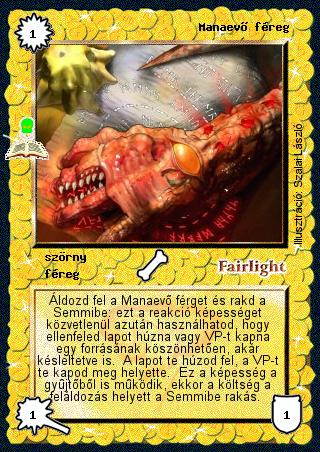 Kiadás: A férgek háborúja (Zén) Gyakoriság: ritka Lapszín (isten): Fairlight Típus: szörny Altípus: féreg Szöveg: Áldozd fel a Manaevő férget és rakd a Semmibe: ezt a reakció képességet közvetlenül azután használhatod, hogy ellenfeled lapot húzna vagy VP-t kapna egy forrásának köszönhetően, akár késleltetve is. A lapot te húzod fel, a VP-t te kapod meg helyette. Ez a képesség a gyűjtőből is működik, ekkor a költség a feláldozás helyett a Semmibe rakás. Illusztráció: Szalai László
