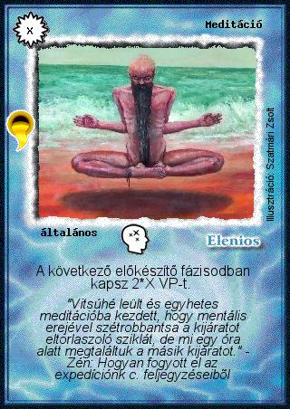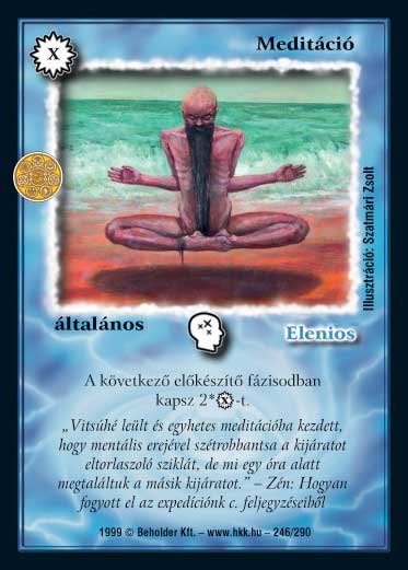 Kiadás: Aranyforrás, Túlélők Földje Gyakoriság: ritka Lapszín (isten): Elenios Típus: általános Szöveg: A következő előkészítő fázisodban kapsz 2*X VP-t. Szinesítő szöveg: "Vitsúhé leült és egyhetes meditációba kezdett, hogy mentális erejével szétrobbantsa a kijáratot eltorlaszoló sziklát, de mi egy óra alatt megtaláltuk a másik kijáratot." - Zén: Hogyan fogyott el az expedíciónk c. feljegyzéseiből Illusztráció: Szatmári Zsolt