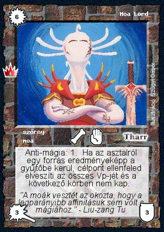 Kiadás: Ősi legendák Gyakoriság: nem gyakori Lapszín (isten): Tharr Típus: szörny Altípus: moa Szöveg: Anti-mágia: 1. Ha az asztalról egy forrás eredményeképp a gyűjtőbe kerül, célpont ellenfeled elveszíti az összes Vp-jét és a következő körben nem kap. Szinesítő szöveg: "A moák vesztét az okozta, hogy a legparányibb affinitásuk sem volt a mágiához." - Liu-zang Tu Illusztráció: