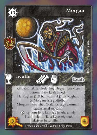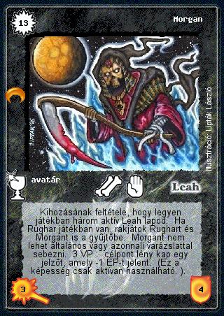 Szöveg: Kihozásának feltétele, hogy legyen játékban három aktív Leah lapod. Ha Rughar játékban van, rakjátok Rughart és Morgant is a gyűjtőbe. Morgant nem lehet általános vagy azonnali varázslattal sebezni. 3 VP: célpont lény kap egy jelzőt, amely -1 ÉP-t jelent. (Ez a képesség csak aktívan használható. ).