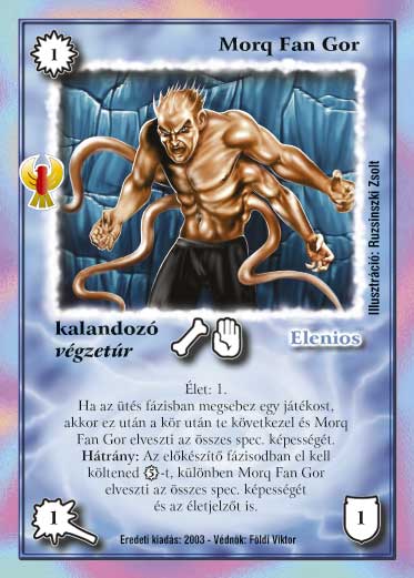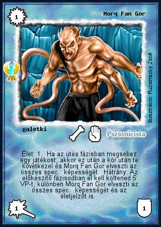 Szöveg: Élet: 1. Ha az ütés fázisban megsebez egy játékost, akkor ez után a kör után te következel és Morq Fan Gor elveszti az összes spec. képességét. Hátrány: Az előkészítő fázisodban el kell költened 5 VP-t, különben Morq Fan Gor elveszti az összes spec. képességét és az életjelzőt is.