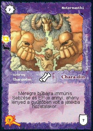 Szöveg: Méregre bűbájra immúnis. Sebzése és ÉP-je annyi, ahány lényed a gyűjtőben volt a játékba hozatalakor.