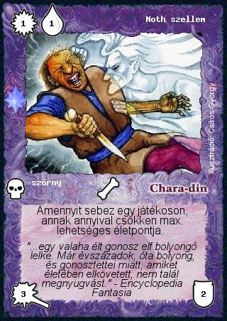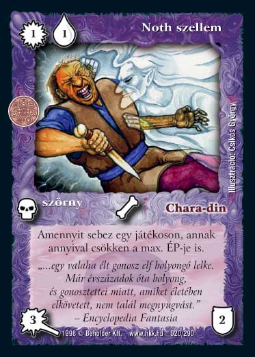 Kiadás: Ezüsthajnal, Túlélők Földje Gyakoriság: gyakori Lapszín (isten): Chara-din Típus: szörny Szöveg: Amennyit sebez egy játékoson, annak annyival csökken max. lehetséges életpontja. Szinesítő szöveg: "...egy valaha élt gonosz elf bolyongó lelke. Már évszázadok, óta bolyong, és gonosztettei miatt, amiket életében elkövetett, nem talál megnyugvást." - Encyclopedia Fantasia Illusztráció: Csikós György