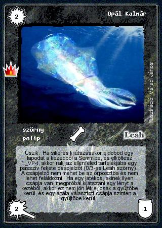 Kiadás: Ősi legendák Gyakoriság: ritka Lapszín (isten): Leah Típus: szörny Altípus: polip Szöveg: Úszik. Ha sikeres kijátszásakor eldobod egy lapodat a kezedből a Semmibe, és elköltesz 1 VP-t, akkor rakj az ellenfeled tartalékjába egy passzív fekete csápjelzőt (0/3-as Leah szörny). A csápjelző nem mehet be az őrposztba és nem lehet feláldozni. Ha egy játékos, akinek ilyen csápja van, megpróbál kijátszani egy lényt a kezéből, akkor ez nem jön létre, csak a gyűjtőbe kerül, és egy általa választott csápja szintén a gyűjtőbe kerül. Illusztráció: Váradi János