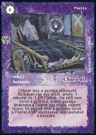 Szöveg: Célpont lény a gazdája előkészítő fázisában kap egy jelzőt, amely -1 sebzést és -1 ÉP-t jelent. Ha ettől nem került a gyűjtőbe, a lény gazdája átrakhatja a Pestist egy másik célpont lényre, ha viszont ettől a gyűjtőbe került, a Pestist 4 VP elköltésével visszaveheted a kezedbe.
