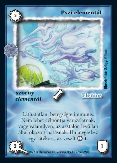 Kiadás: Alanori Krónika, Túlélők Földje Gyakoriság: ritka Lapszín (isten): Elenios Típus: szörny Szöveg: Láthatatlan, betegségre immúnis. Nem lehet célpontja varázslatnak, vagy valamilyen, az asztalon levő lap által okozott hatásnak. Ha megsebez egy játékost, az veszít 1 VP-t. Illusztráció: