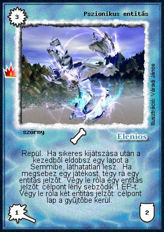 Szöveg: Repül. Ha sikeres kijátszása után a kezedből eldobsz egy lapot a Semmibe, láthatatlan lesz. Ha megsebez egy játékost, tégy rá egy entitás jelzőt. Végy le róla egy entitás jelzőt: célpont lény sebződik 1 ÉP-t. Végy le róla két entitás jelzőt: célpont lap a gyűjtőbe kerül.