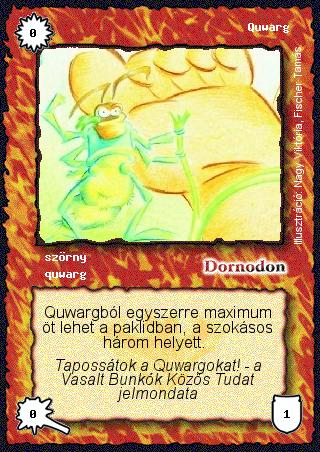 Hatalom Kártyái kártyalap - Quwarg(AK11) Miután a Destabilizátor nem hozta meg a rengeteg ellenvarázslat ellenszerét, ezért ezentúl a Quwargokhoz hasonlóan ebből is öt lehet a pakliban. Ez a versenyekre is érvényes. | (AK20) Ha az ellenfelem kijátszik egy Quwargot, és húzni akar a Káoszhordával, nincs lehetőségem a kijátszás és a húzás között reagálni. A Káoszhorda húzása nem külön cselekvés, hanem úgy kell tekinteni, hogy ha akarod, 2 VP-vel drágábban játszhatod ki a lényeidet, és ilyenkor húzhatsz egy lapot. | (AK27) Alapesetben a Quwarg harcost nem öli meg A halál csókja, mivel 1/2-es lény. Ha van rajta egy Óriáserő, akkor belehalna, de az a képessége, hogy quwargokat lehet áldozni neki, életmentő hatás, tehát így életben lehet tartani. Téves az a felfogás, miszerint ha egy quwargot beáldozok a harcosnak, akkor kap +2/+1-et, tehát a sebzése is nő, ezért így nem lehet megmenteni. Ilyenkor ugyanis először sebez A halál csókja, csak utána áldozom a quwargokat, azaz a harcos így megnövelt sebzése már nem növeli A halál csókjának sebzését. Ha azonban az Óriáserő helyett egy Quwarg bolyom van játékban, akkor nem csak a harcos, hanem a kis Quwargok is belehalnak A halál csókjába, tehát nem lehet őket feláldozni a harcos megmentésére. | (AK3) A Quwarg az ellenfél lényét támadja, a Quwarg harcos átüt az őrposzton. A Quwargot, mielőtt a tényleges sebzés megtörténne, a gyűjtőbe dobhatom, megnövelve a Quwarg harcos sebzését. | (AK3) Ha a Quwarg harcosom halálos sebzést kap, még eldobhatok egy Quwargot, hogy megnöveljem az ÉP-jét, és ezzel megmentsem. A szabálykönyv definíciója szerint ilyenkor még játszható ki olyan hatás vagy lap, amely a lény ÉP-jét növeli. | (AK3) Igaz, hogy sokan Quwarg kártyát használnak Quwarg jelzőnek, de az még attól jelző marad, és nem marad a gyűjtőben. A Quwarg királynő által előállított jelzőket a gyűjtőbe lehet dobni a Quwarg harcos erősítésére, de nem tápolják az Élőholt quwargot. | (AK37) Ha Kisebb Zannal másolok egy Quwargot, akkor azt feláldozva kihozhatom belőle az Óriásférget. Először megállapítom, hogy teljesül az Óriásféreg kijátszási feltétele, mert van zanom a játékban, ezután kijátszom a férget, és a gyűjtőbe dobom a Quwarggá alakult Kisebb Zant. | (AK43) Idegen tollakkal egy Quwargnak átadom az Illúziósárkány speciális képességeit és hátrányait. Mivel mindkét lapon a kör vége szerepel, ezért a HKK alapszabályát követjük, mely szerint a kör végén a hatások elmúlásának sorrendjét az a játékos dönti el, akinek a köre van. | (AK45) Játékban van egy Iszonyat, egy Pozitív létsík, egy Quwarg és egy Teológia. Mivel a Quwarg nem eshet le a sík miatt, ezért a Teológia a gyűjtőbe kerül. | (AK65) A Megtestesülés képességeit és hátrányait Idegen tollakkal átadom egy Quwargnak. Nem sebződöm akkor, amikor a Quwarg a kör végén a gyűjtőbe kerül, ugyanis a Quwarg a következő képességeket és hátrányokat kapja: "Kijátszási feltétele, hogy feláldozd X ÉP-d. Ha a Megtestesülés (vagyis jelen esetben a Quwarg) a játékból a gyűjtőbe kerül, sebződsz X ÉP-t." Miután a Quwarg kijátszásakor 0 ÉP-t áldoztam, ezért nem is sebződök a gyűjtőbe kerülésekor. | A szabály módosult, lásd AK99-nél.