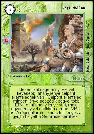 Szöveg: Idézési költsége annyi VP-vel kevesebb, ahány lénye célpont ellenfelednek van. Célpont ellenfeled minden lénye sebződik eggyel több ÉP-t, mint ahány lénye van, majd ugyanennyivel csökken a max. VP-je is. A régi dallamtól elpusztult lények a gyűjtő helyett a Semmibe kerülnek.