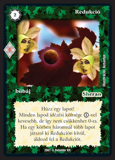 Szöveg: Húzz egy lapot! Minden lapod idézési költsége 1_VP-vel kevesebb, de igy nem csökkenhet 0-ra. Ha egy körben háromnál több lapot játszol ki Redukción kívül, áldozd fel a Redukciót.