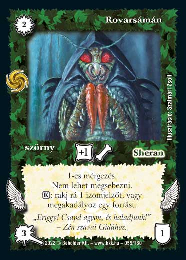 Kiadás: Résföld Gyakoriság: ritka Lapszín (isten): Sheran Típus: szörny Szöveg: 1-es mérgezés. Nem lehet megsebezni. (K): rakj rá 1 izomjelzőt, vagy megakadályoz egy forrást. Szinesítő szöveg: "Eriggy! Csapd agyon, és haladjunk!" - Zén szavai Gidához. Illusztráció: Szatmári Zsolt